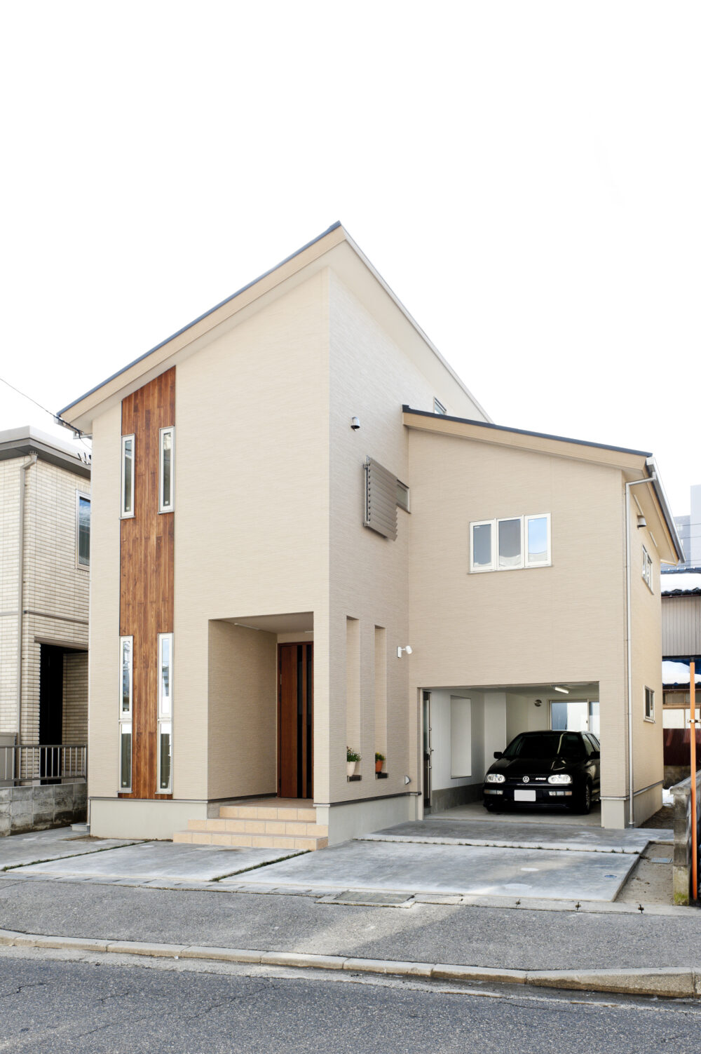 コンパクトなビルトインガレージと勾配天井のスキップフロア空間を楽しむ家です。