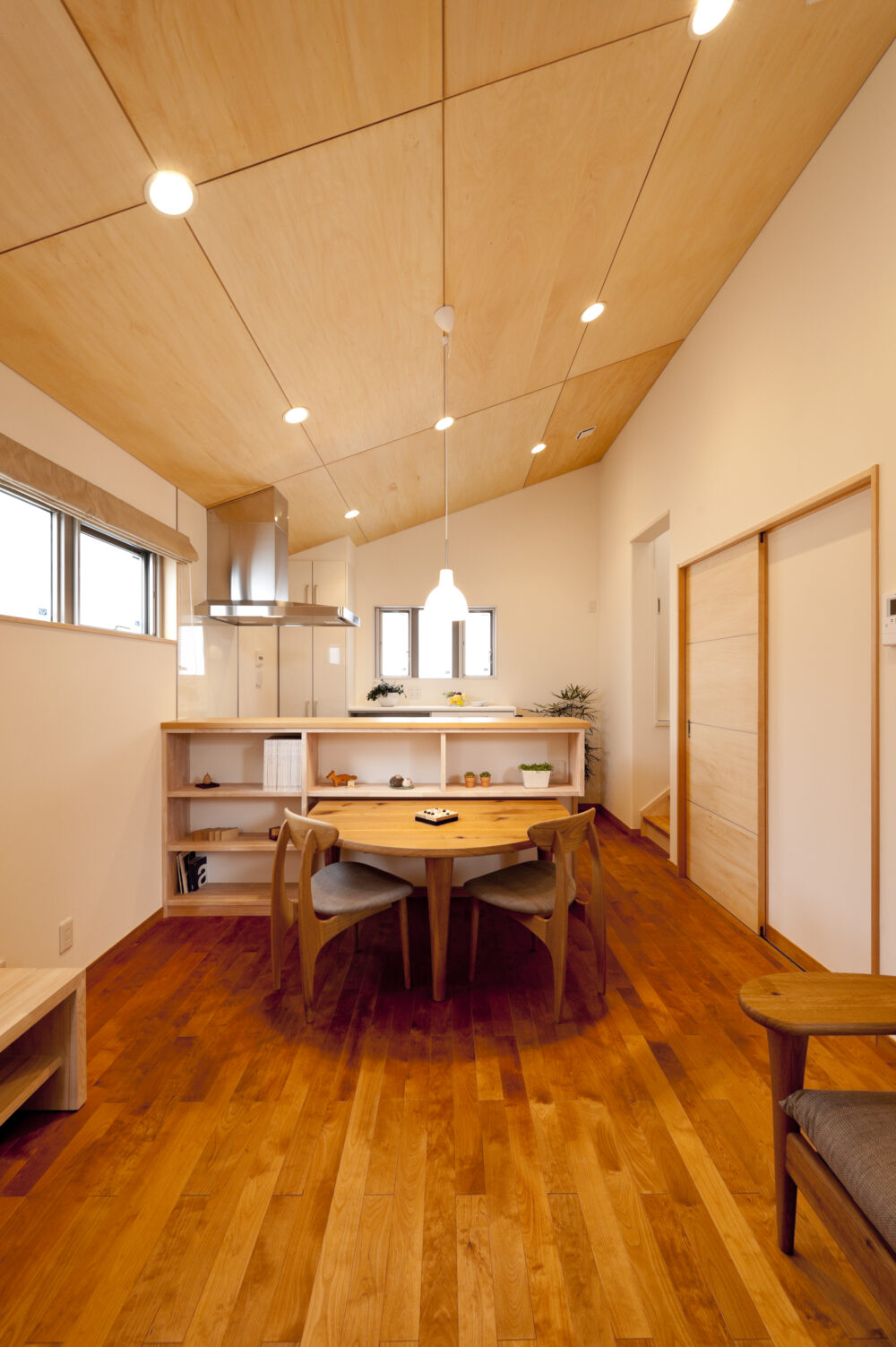 床にはオークの無垢フローリングを採用し、素材感をたっぷりと感じる落ち着いたインテリアでまとめました。