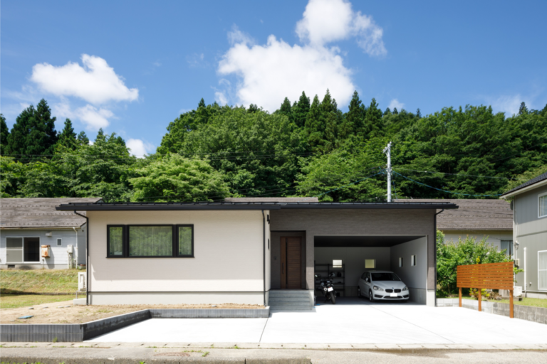 自然に囲まれ趣味と景色を楽しむ家 ―平屋のガレージハウス―
